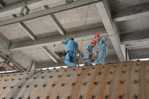 “高空作业”——图为水泥分厂2#水泥磨上,工人们正在拆卸磨门